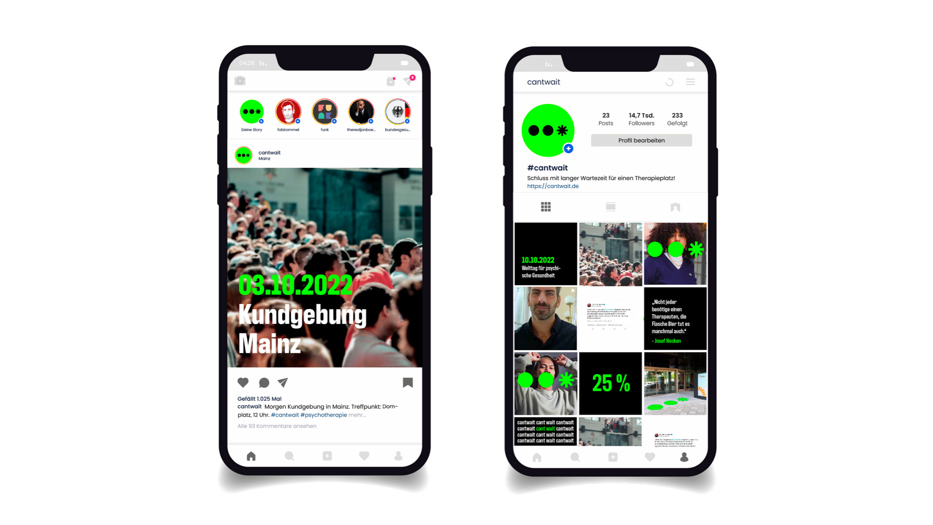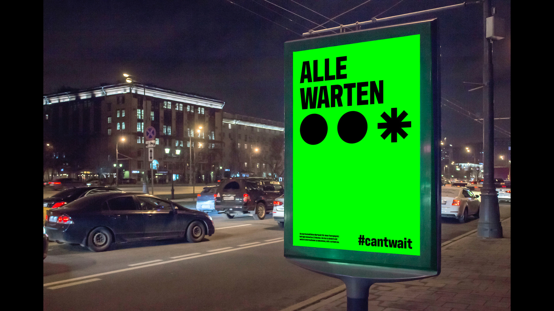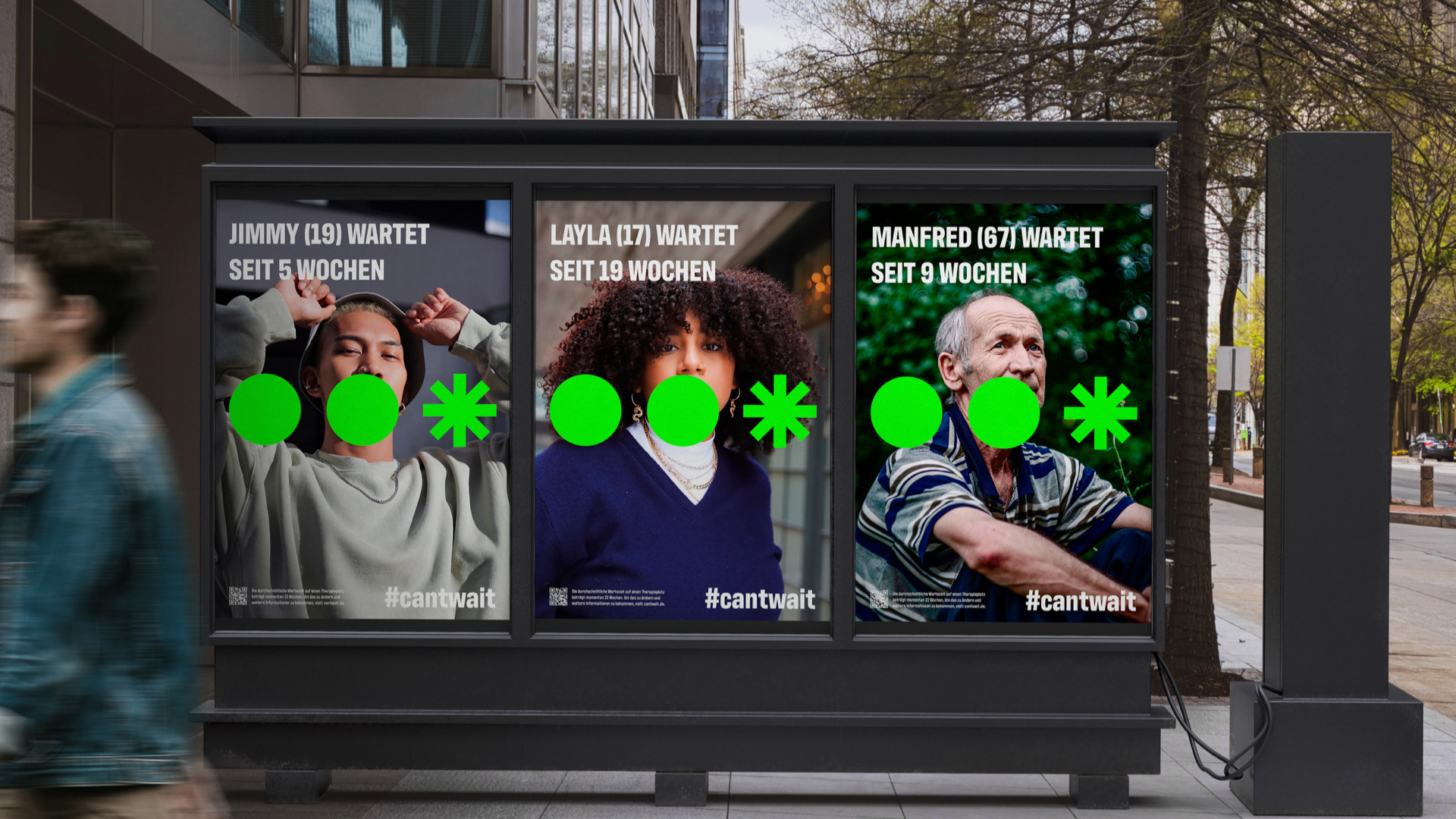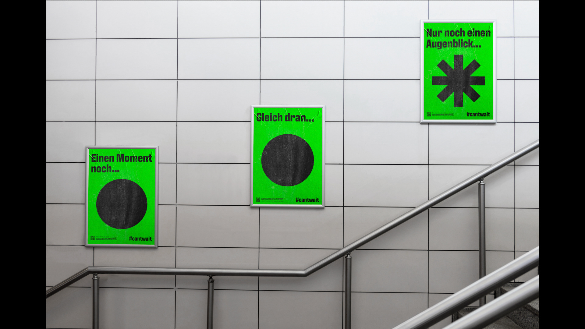 22 Wochen beträgt die durchschnittliche Wartezeit auf einen Psychotherpieplatz in Deutschland. In Gruppenarbeit haben wir „can‘t wait“ entwickelt, damit das Thema mehr Aufmerksamkeit bekommt und Veränderung durch eine Petition erreicht wird. Das Logo wurde aus drei Punkten erstellt, welche für das Warten stehen. Als Störmerkmal fungiert der dritte Punkt: Er explodiert und zeigt so die Dringlichkeit, welche durch den Namen unterstützt wird.